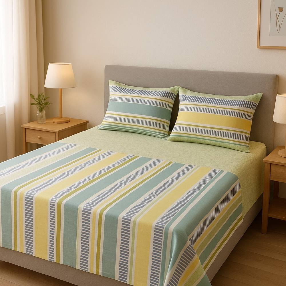 Juego de Sábanas 144 Hilos – Rayas amarillo, verde y azul